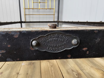 New in Quality Antique circa 1880s Heal & Son, Tottenham Court Road brass & Iron 3ft 6in large single footless bed frame. Ready for restoration in your choice of colour. Fully Restored Price £595 Click Here for Detailed Photographs, Description and Dimensions Code BA1230 Unrestored Bed Frame ( Price includes full restoration in your choice of colour) |