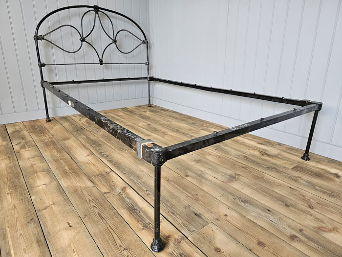 Heavy French small double all iron bed frame in a traditional shape. New in from Normandy, France. SOLD (code: BA713) Photos show bed in unrestored condition |