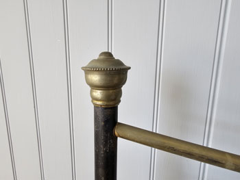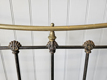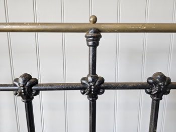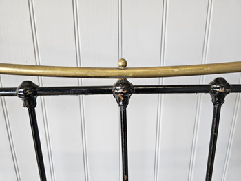Handsome and sturdy Victorian 4ft bed frame with fleur de lis castings, brass knobs and bars to head and foot ends. SOLD (code: BA073) Photos show bed in unrestored condition |