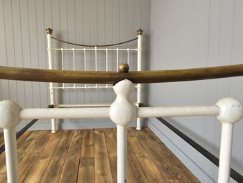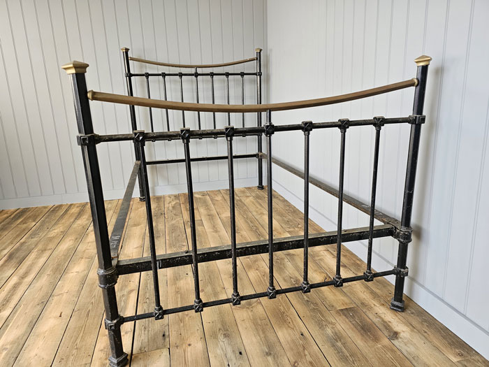 Fully restored beds are stripped down, shot blasted, bare metal primed, re-painted and re-polished. Any brass work that is damaged beyond repair is replaced with antique brass if available or solid brass restoration parts. Any damaged cast iron or metal work is always professionally welded. All the beds have minor knocks and bumps to the metal and brass which adds to their charm.