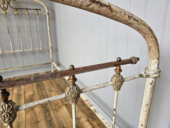 Lovely antique French 4ft bed frame with the classic French rings design to head and foot ends and fleur de lis castings SOLD (code: BA056) Photos show bed in unrestored condition |