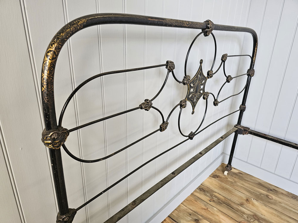 Untouched Antique Victorian 4ft 6in brass and iron double bed frame with the original paint and gold stencils. Ready for restoration in your choice of colour or sympathetic restoration.