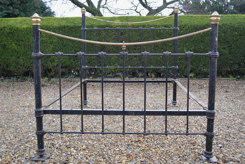 Code BA508 Victorian brass and iron double bed frame with 2 inch posts, dipped rails and brass chinese hat type caps.