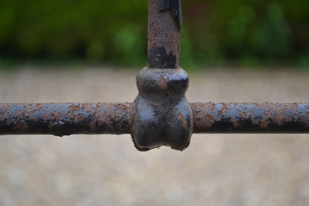 Code BA660 Victorian footless brass and iron double bedstead with straight brass bar and brass bed knobs. Found in a barn.