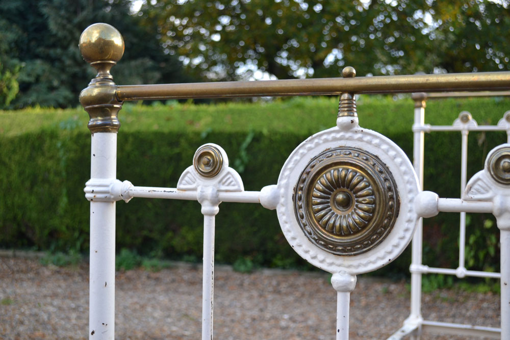 Antique Brass & Iron 4ft 6in double bed frame with 3 large brass discs. The bed is now awaiting restoration in your choice of colour.