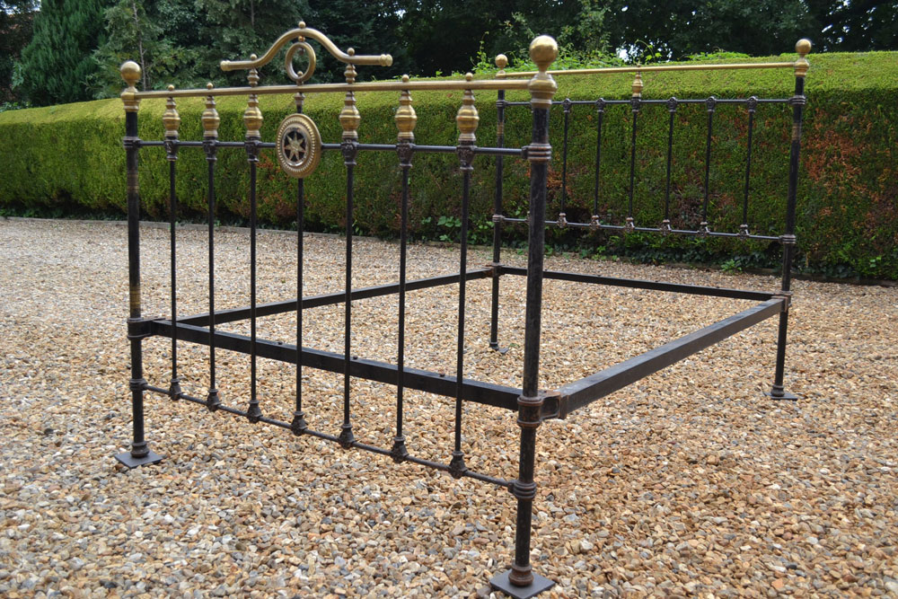 Lovely Antique Brass & Iron 4ft 6in double bed frame with central disk with Mirror.. The bed is now awaiting restoration in your choice of colour.
