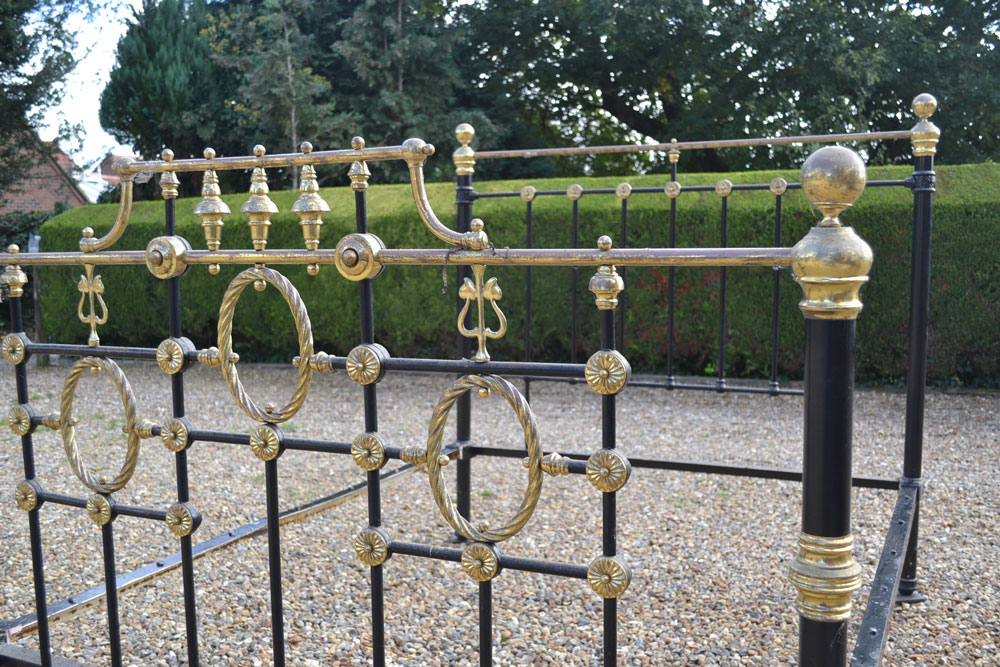 Code BA805 Handsome Victorian brass and iron king size 5ft bedstead with lots of brass details to foot end. The bed has straight brass top rails, a galleried foot end and cast brass cannon ball knobs. The bed has been professionally altered in the past to take a standard UK king size mattress.. Can be finished in any colour .
