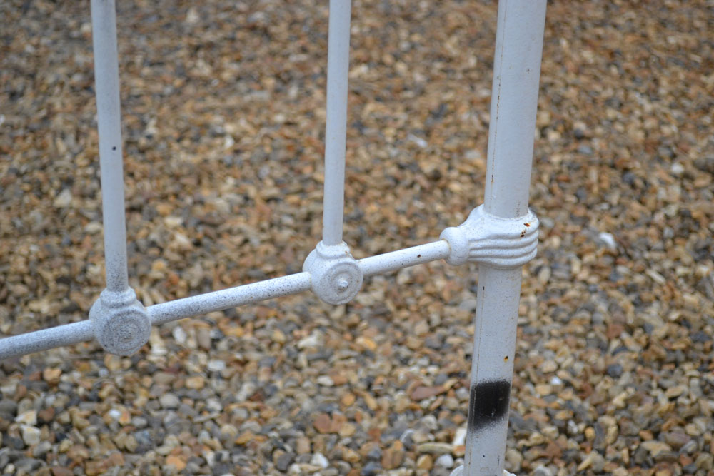 Code BA808 Footless Victorian brass and iron king size 5ft bedstead with small brass discs and turned brass bed finials. The bed has been professionally widened and lengthened in the past to take a standard 5ft king size mattress. Price below is restored in your choice of colour.