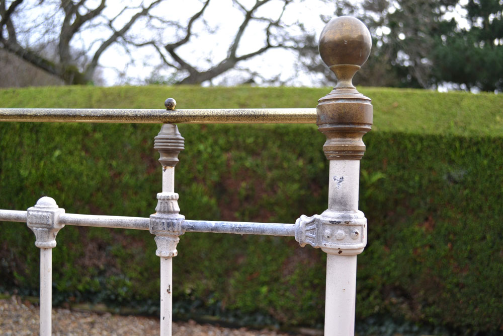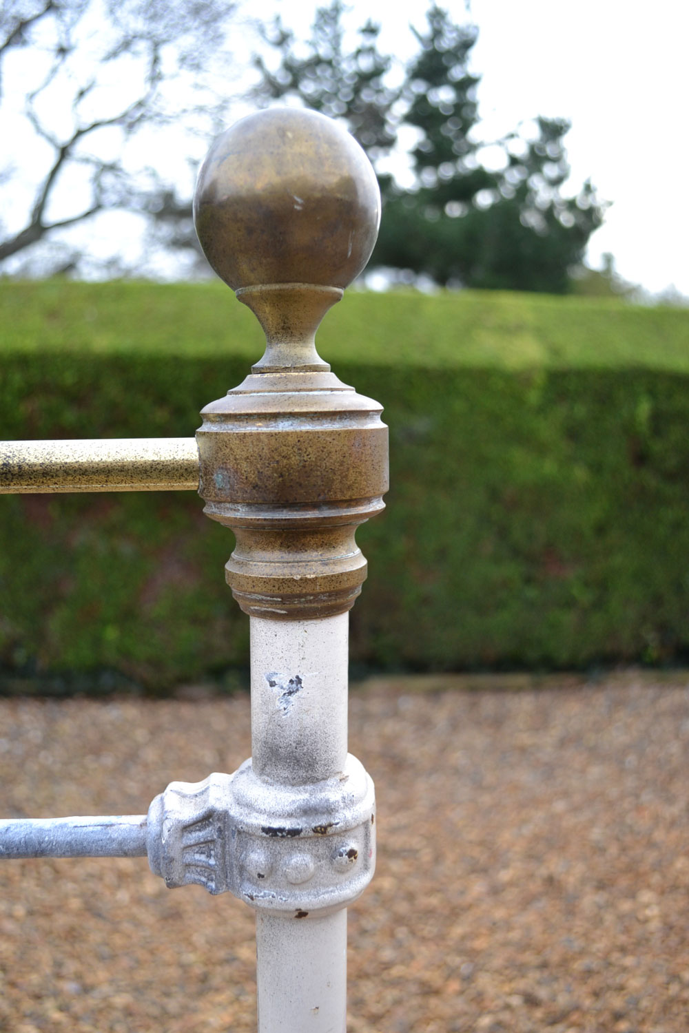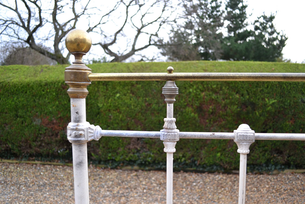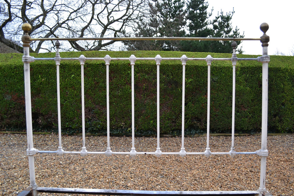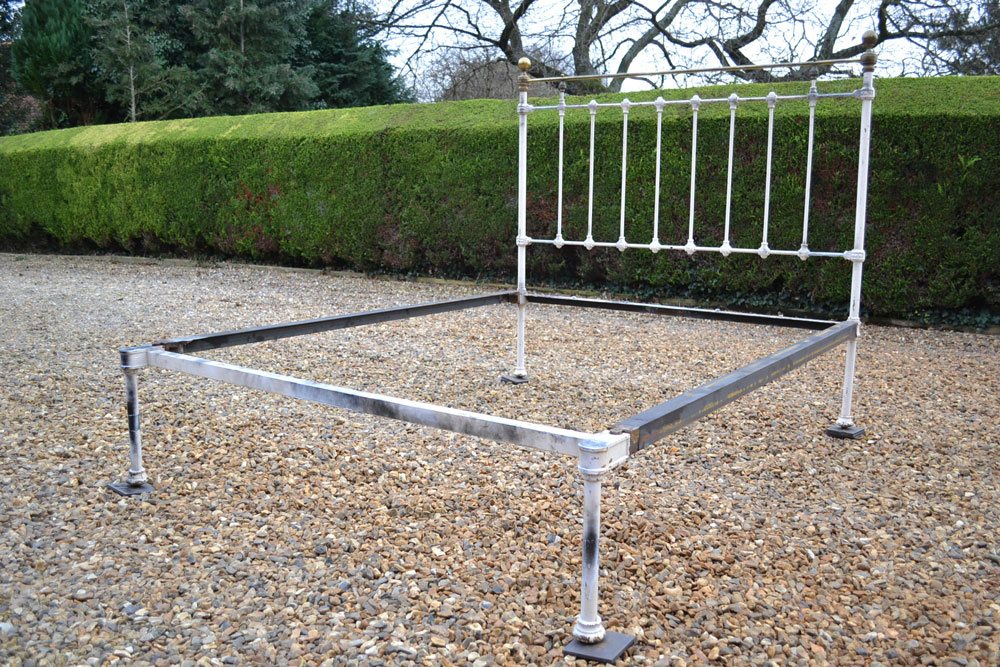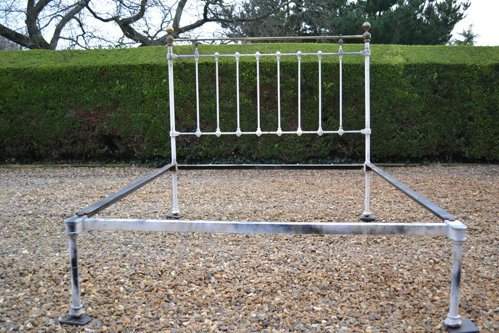 Code BA829 Footless Victorian brass and iron king size 5ft bedstead with straight brass rails and brass bed knobs. The bed has been professionally widened and lengthened in the past to take a standard 5ft king size mattress. Price below is restored in your choice of colour.