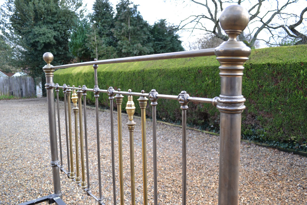 Code BA836 Late Victorian brass and iron king size 5ft bedstead with larger 2 inch posts and dipped brass rails. The bed was professionally restored and widened about 25 years ago but is now ready for restoration again in your choice of colour..