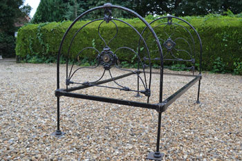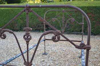 French single iron bed frame with straight foot end and arched head end with classic French castings. SOLD (code: BA300) Photos show bed in unrestored condition |