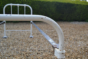 2ft 6in iron dorm bed, type used in Harry potter movies. Ideal for a cottage or room with dropped ceilings or box room. SOLD (code: BA787) Photos show bed in unrestored condition |