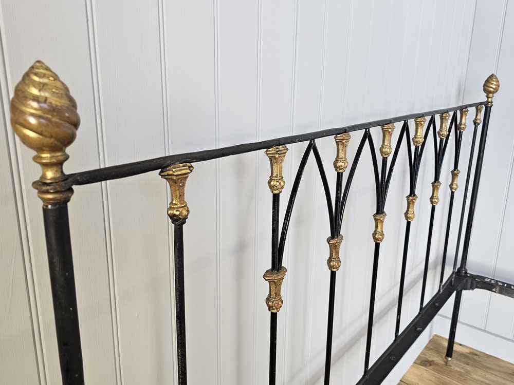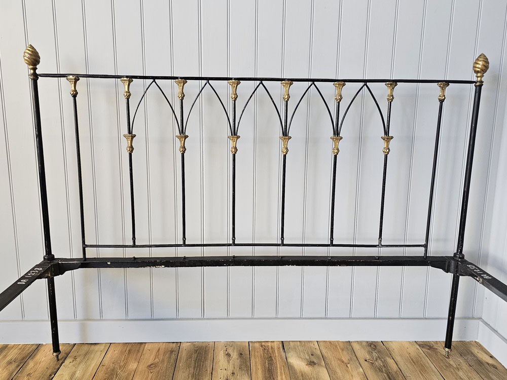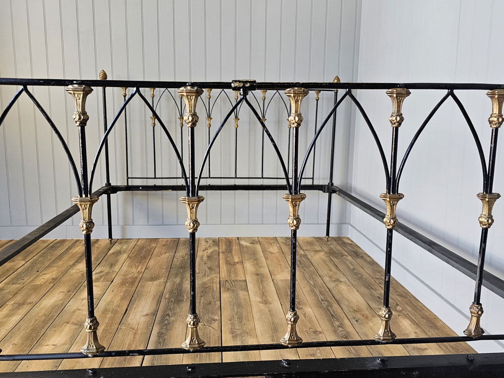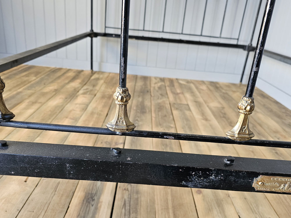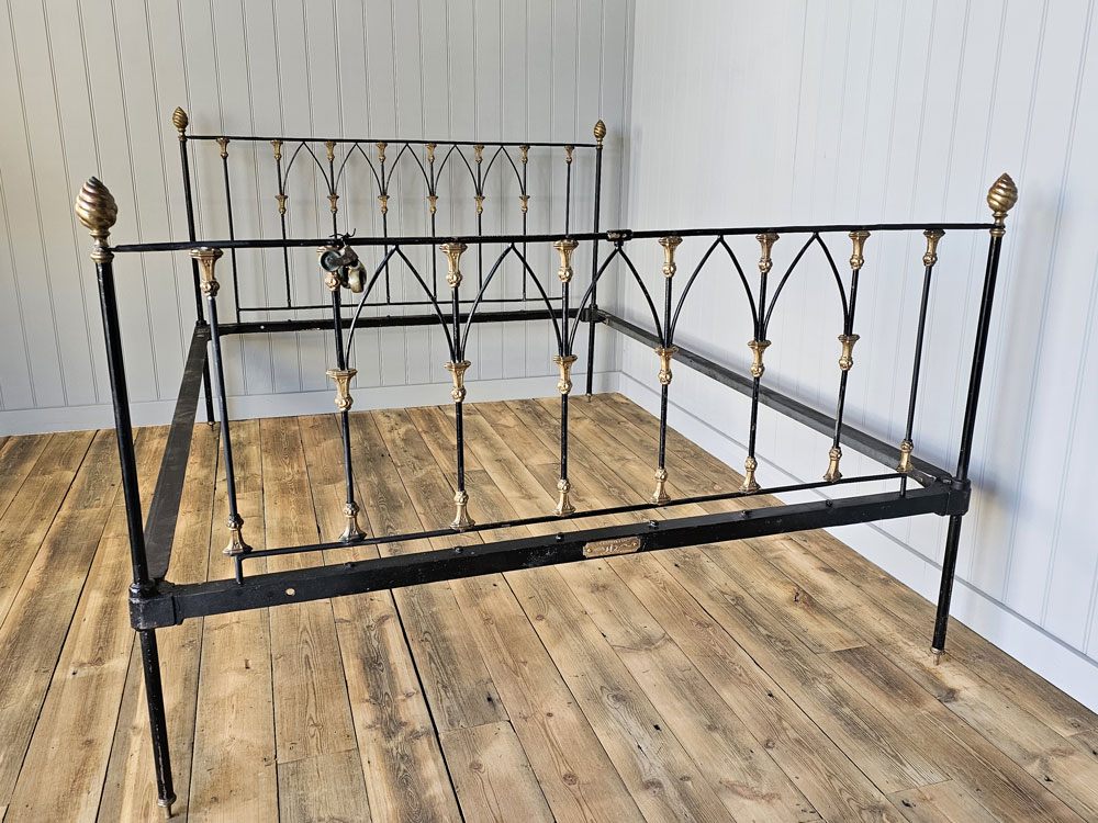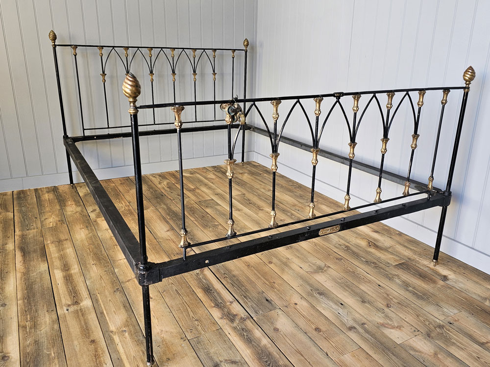 Antique brass and iron R.W Winfield & Son, Circa 1870's 5ft king size bed frame. Bought in the 1980's from Ronnie Barkers Antique Shop, The Emporium in Chipping Norton, Oxfordshire by the previous owner. Quite a unique bed frame with gothic arches and Mr Whippy icecream finials!! The bed has been widened to take a UK King size mattress. Ready for restoration in your choice of colour.