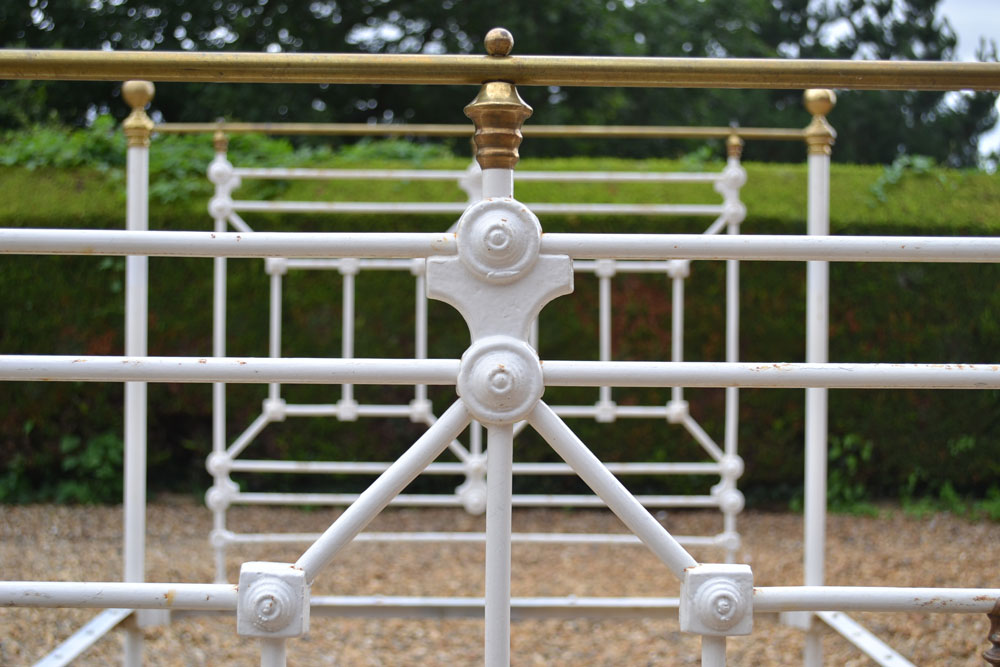 Antique 5ft King size bed frame with 2 large cast brass plates on foot end. The frame has been altered to take a moderm 5ft king size mattress. The bed is now awaiting restoration in your choice of colour.