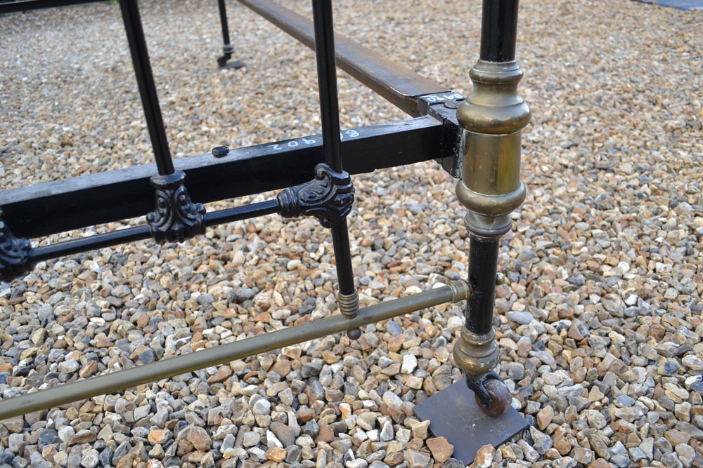 Code BA902 Super Original James Shoolbred & Co of Tottenham House, London Victorian brass and iron king size 5ft bedstead. A rare genuine Victorian 5ft wide built bed. The bed has very good quality castings, straight rails, husks, knees, feet and brass bed knobs. Price includes restoration in your choice of colour.