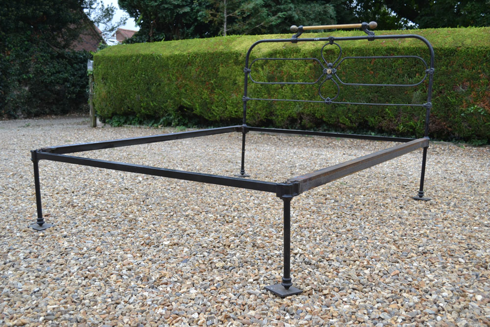 Code BA911 Footless Victorian brass and iron king size 5ft bedstead with a raised brass bar, egg shaped finials and small brass rosette to head end. The bed has been professionally widened and lengthened in the past to take a standard 5ft king size mattress. Price includes restoration in your choice of colour.