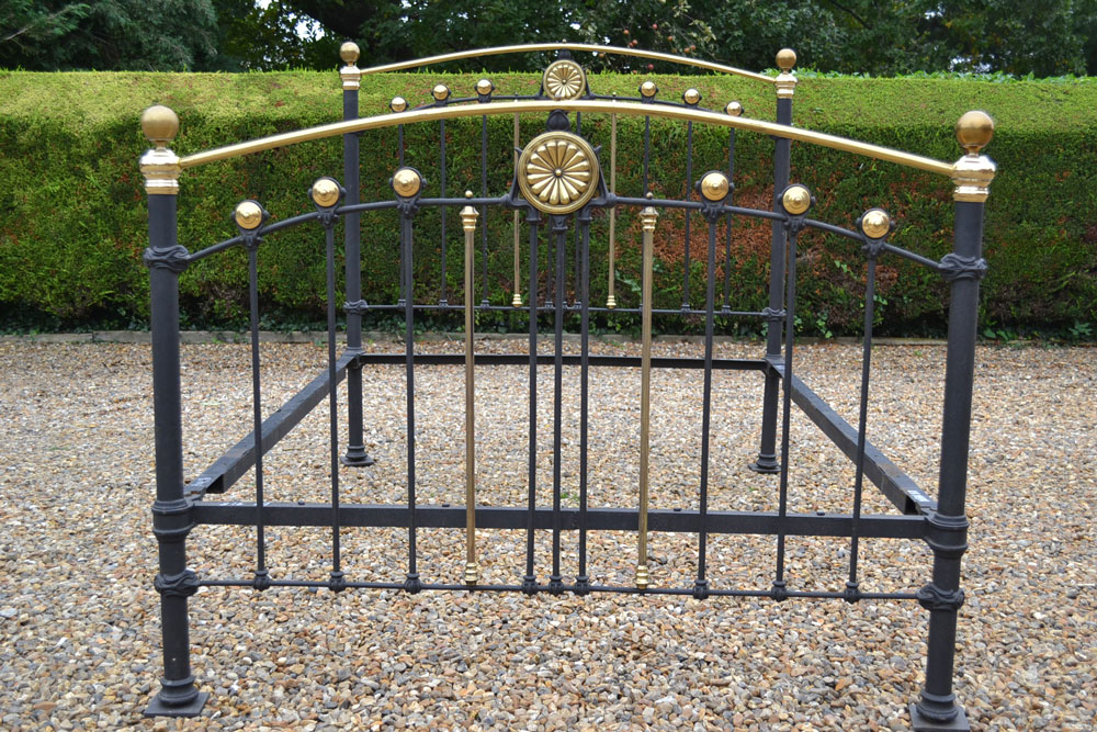 Antique 5ft King size bed frame with large brass central discs, larger 2 inch posts and arched rails. Late Victorian period . The frame has been altered to take a moderm 5ft king size mattress. The bed has not been used for many years and is now awaiting restoration.