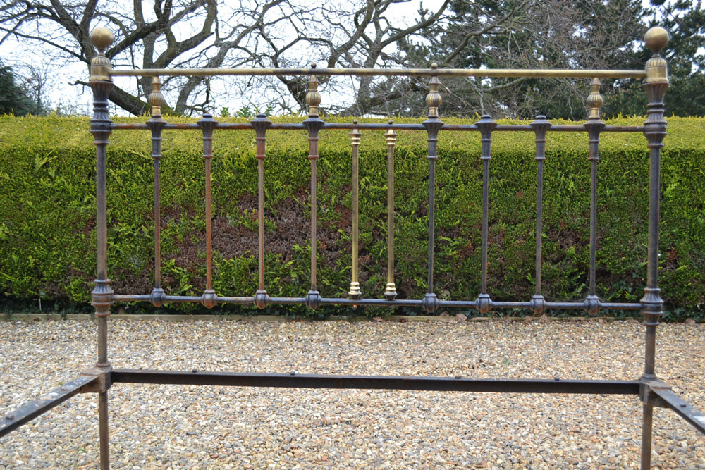 Very heavy Antique Brass & Iron 5ft King size bed frame with straight brass rails, traditional bed knobs and unusual heavy castings. The frame has been altered to take a moderm 5ft king size mattress. The bed has not been used for many years and is now awaiting restoration.