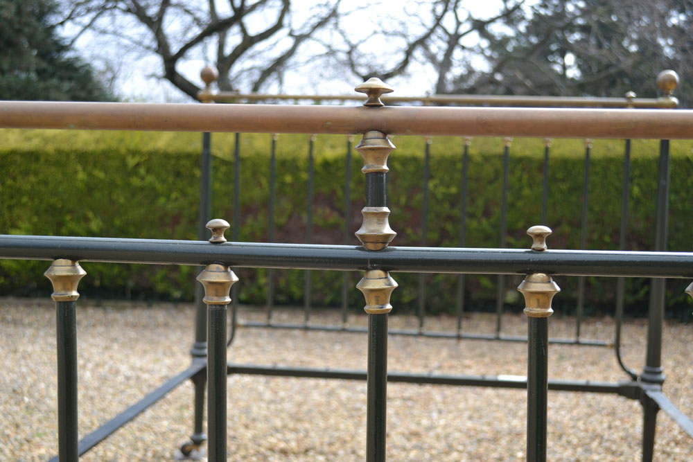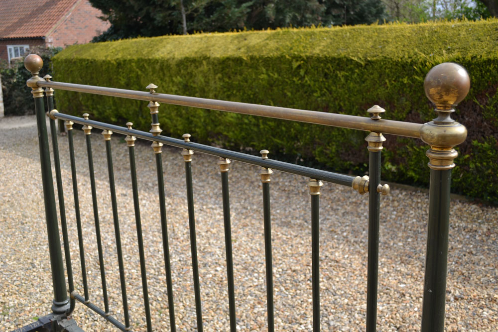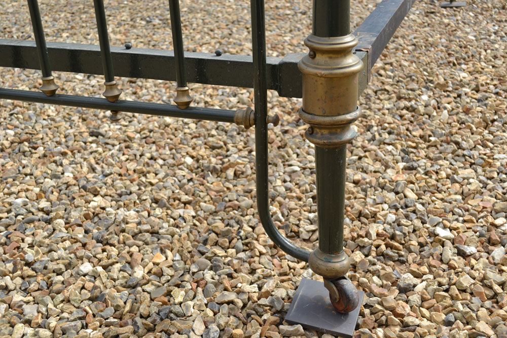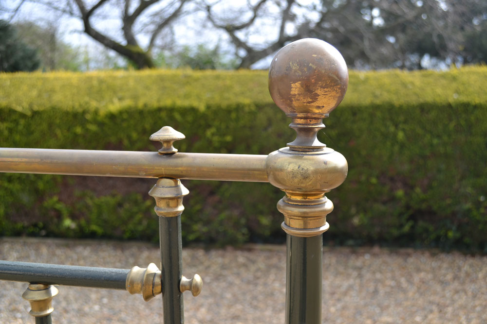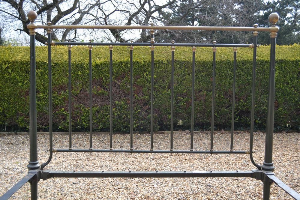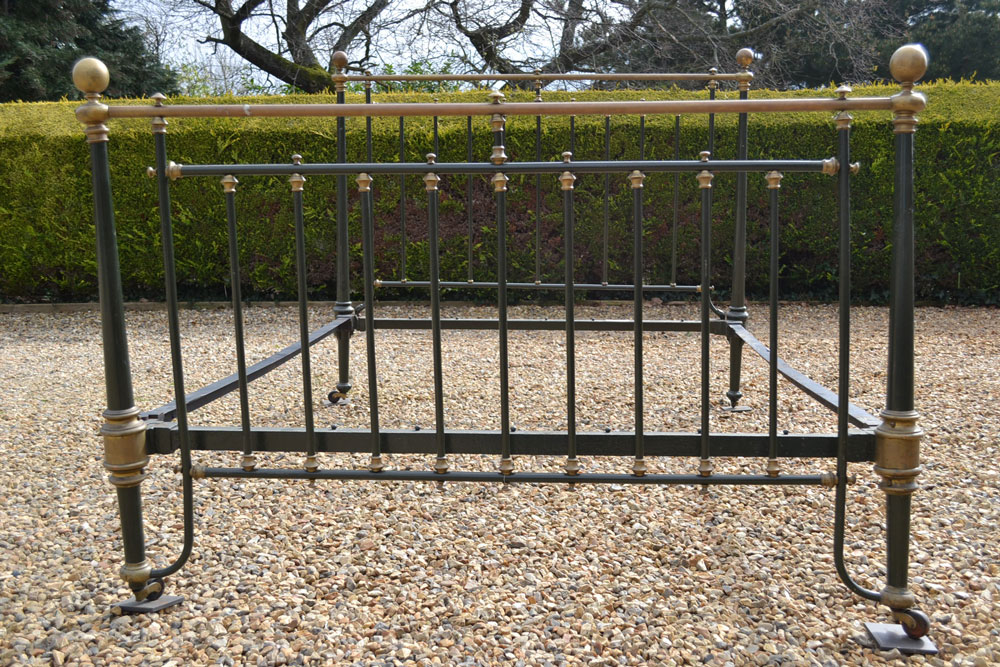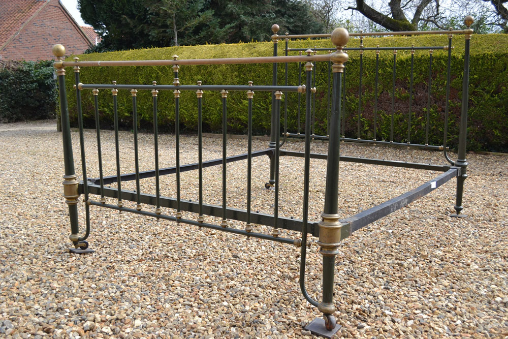 Antique brass and iron 5ft King size bed frame with tapered legs and castors. Good quality bed frame with all cast brass fittings. The frame has been altered to take a moderm 5ft king size mattress. The bed has not been used for many years and is now awaiting restoration.