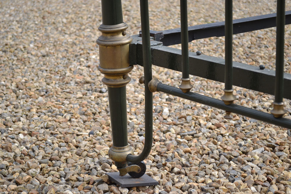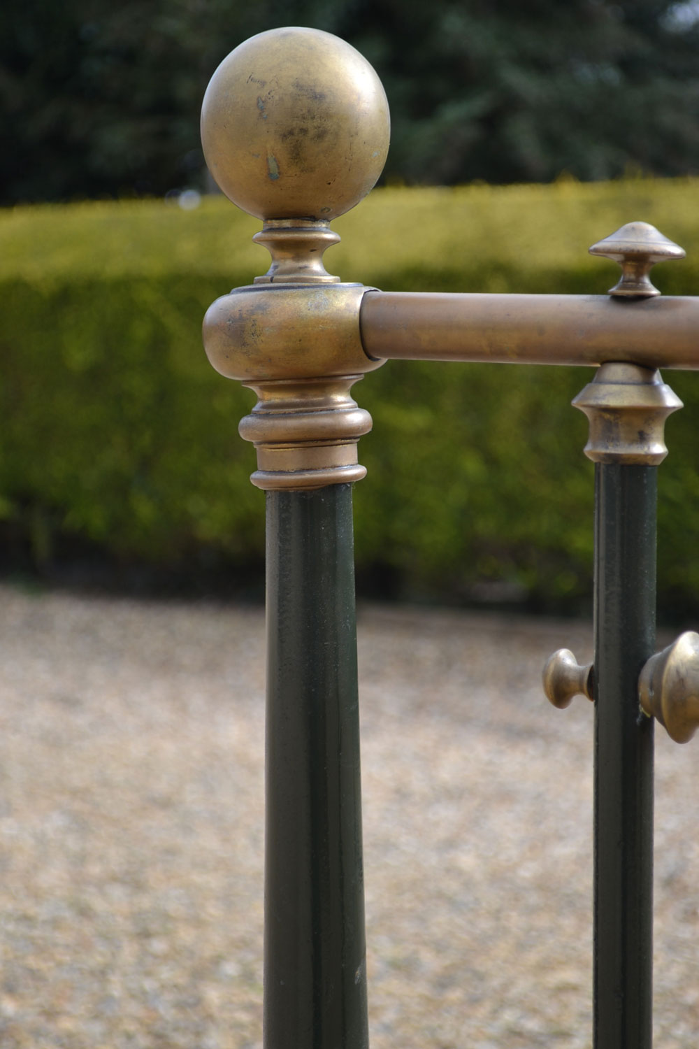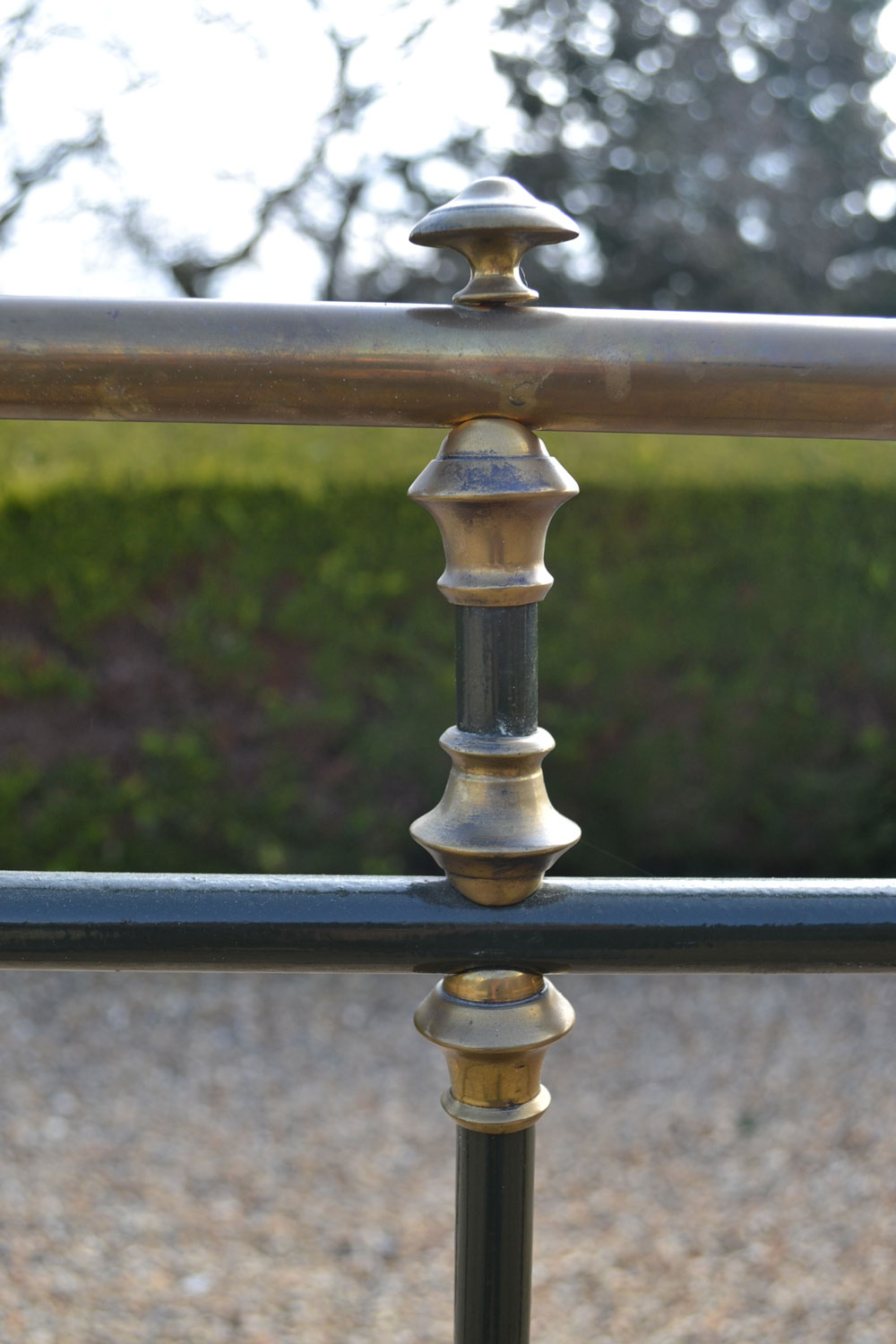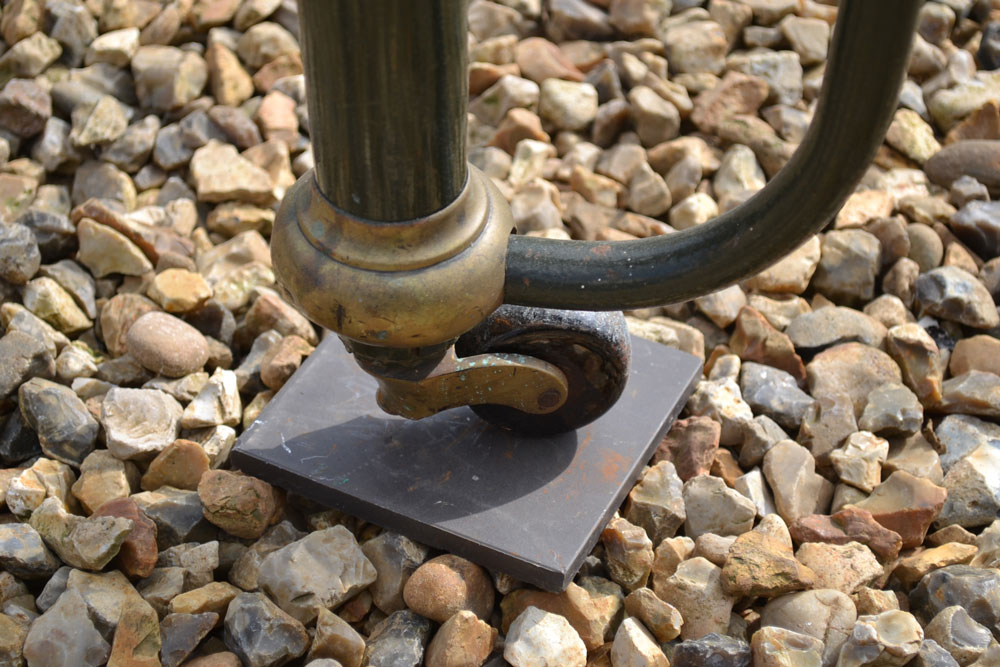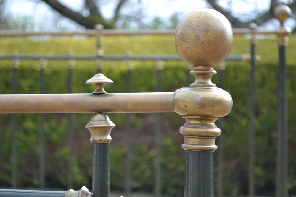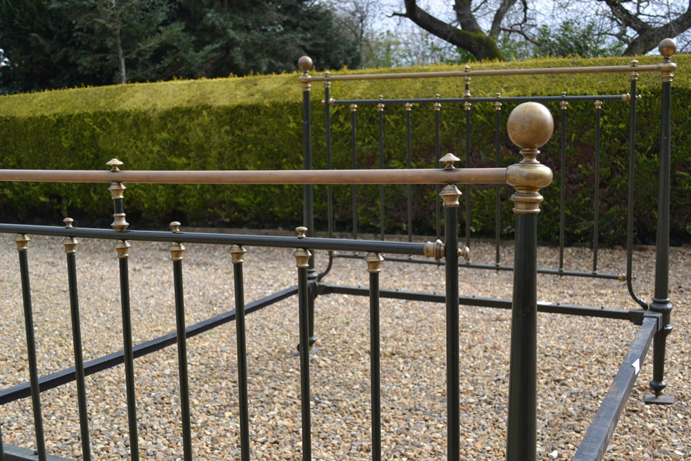Antique brass and iron 5ft King size bed frame with tapered legs and castors. Good quality bed frame with all cast brass fittings. The frame has been altered to take a moderm 5ft king size mattress. The bed has not been used for many years and is now awaiting restoration.