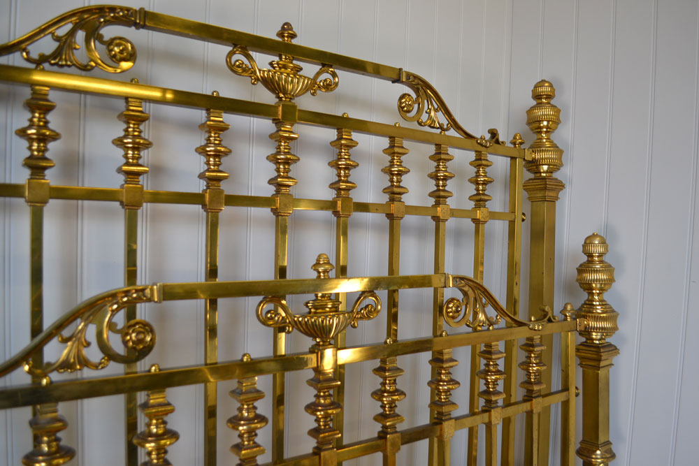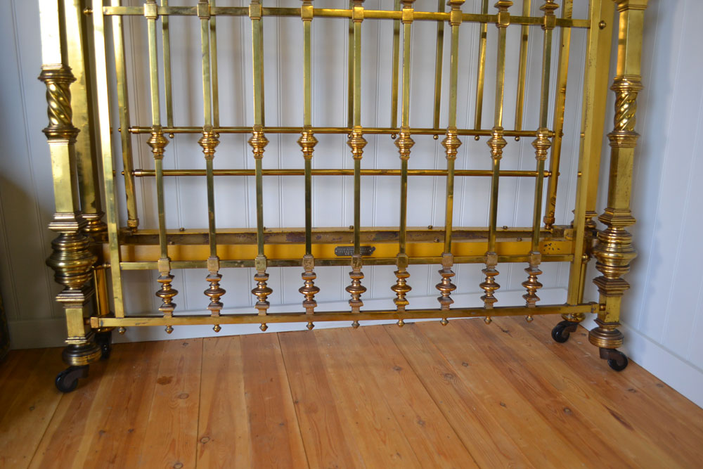 Stunning Huge Antique Victorian James Shoolbred cast brass 5ft king size bed frame. Original 5ft wide. Commissioned for a stately home towards the end of the Victorian period . Head end stands 66 3/4 inches tall and the bed has never been polished from new, original lacquer. Built as a full knockdown so can be taken upstairs more easily. Ive had a few similar beds over the years in this style but this is by far the best and most original. Complete bed frame including side rails. Due to the nature and weight of the bed it needs to be delivered in parts and constructed on site. The bed has been sympatheically cleaned and is ready for use. Delivery to mainland England please email us your postcode.