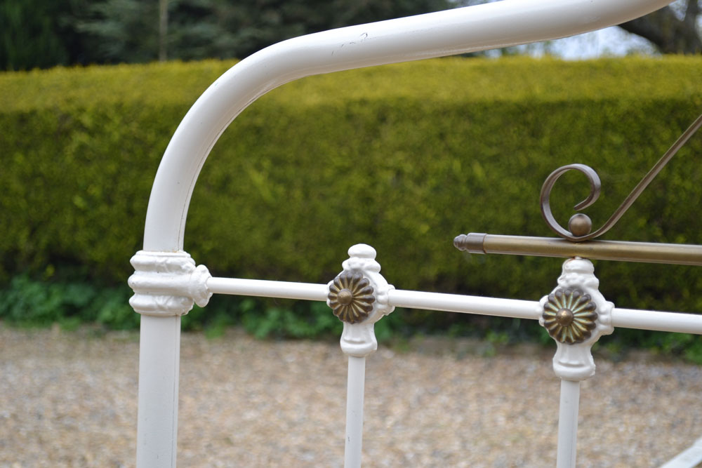 Code BA542 Hard to find French brass and iron double bed with arched frame and brass bars and rings to head and foot ends.