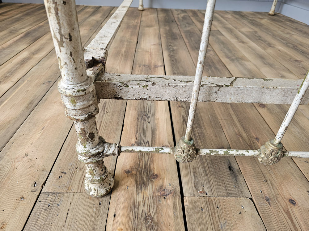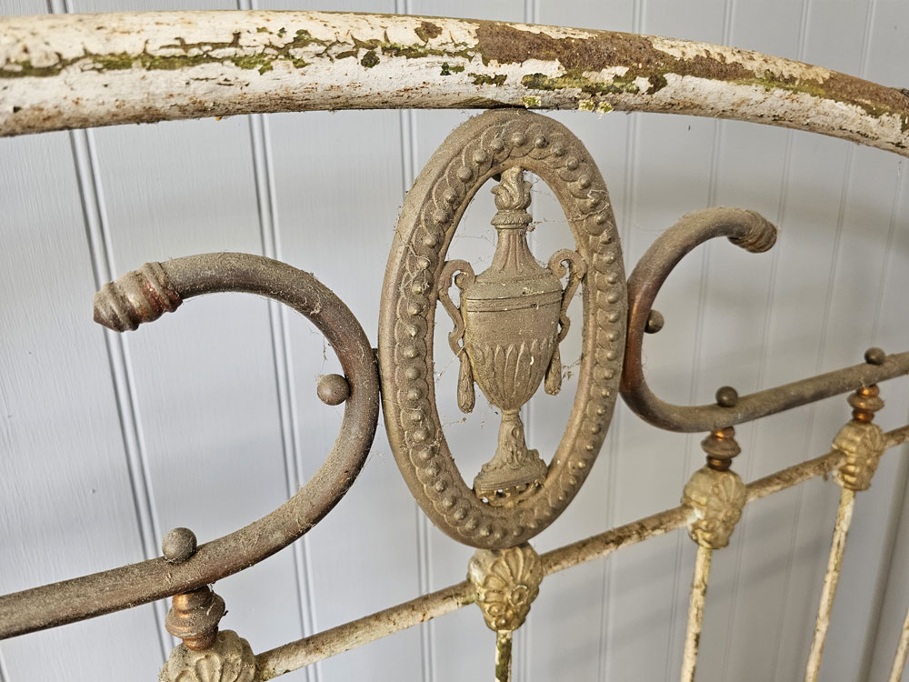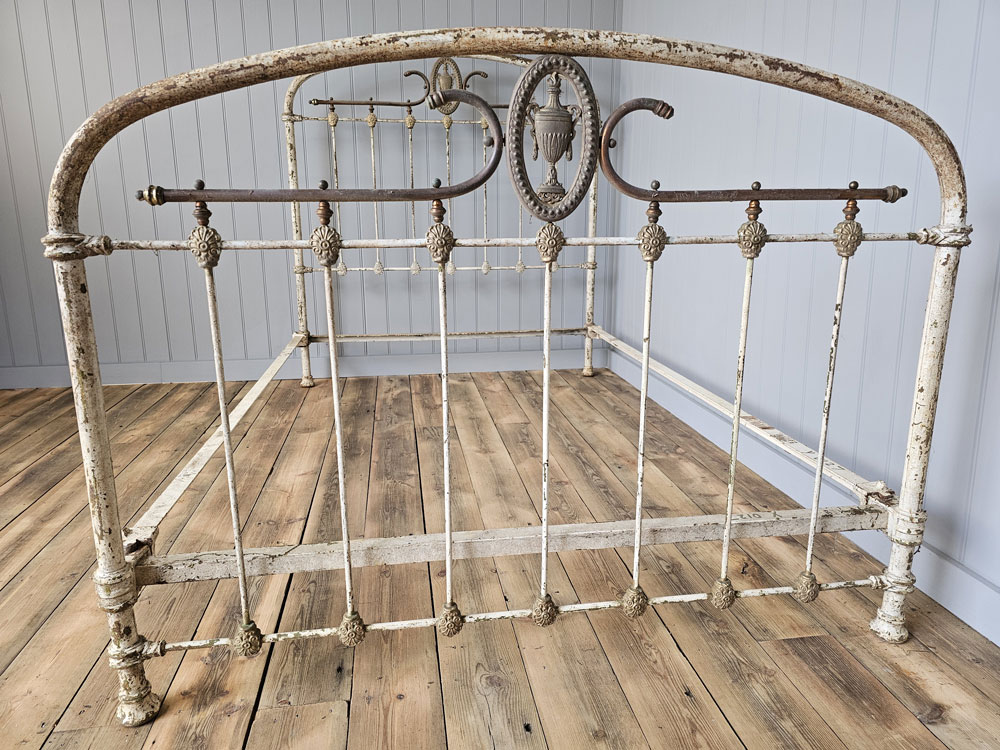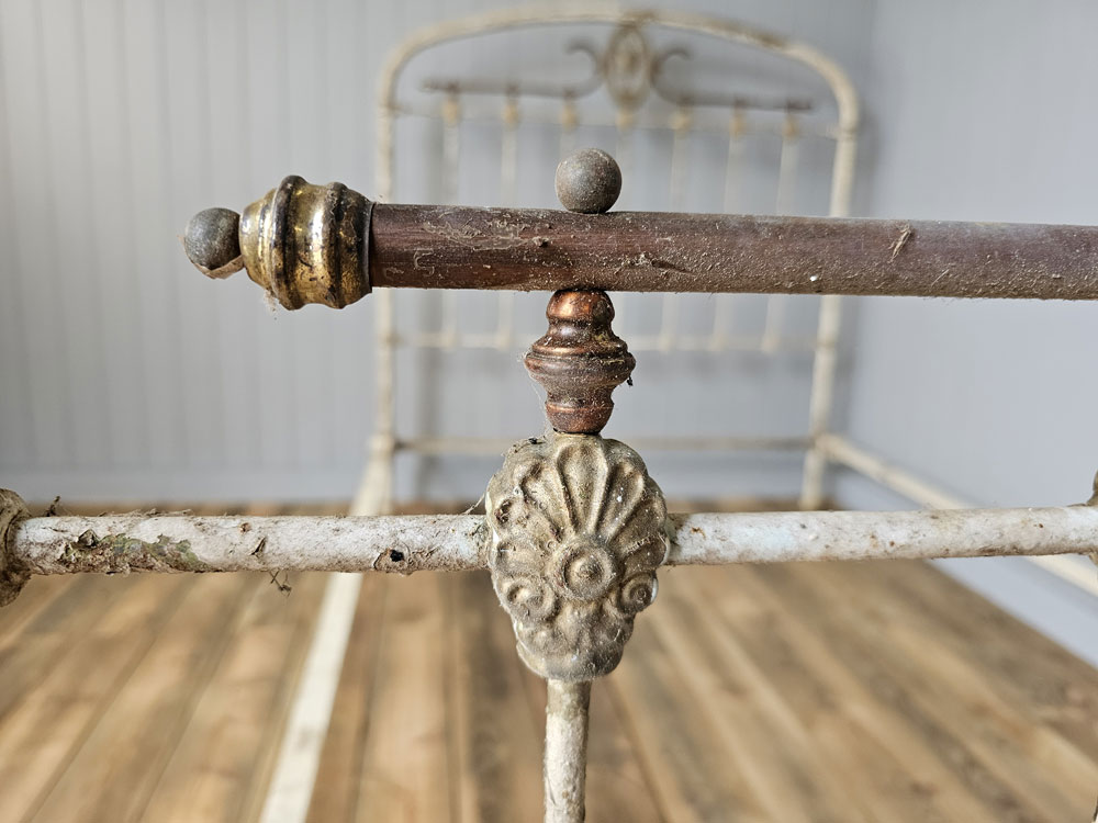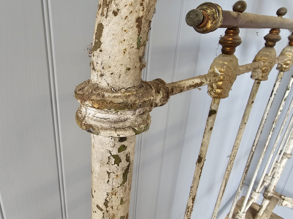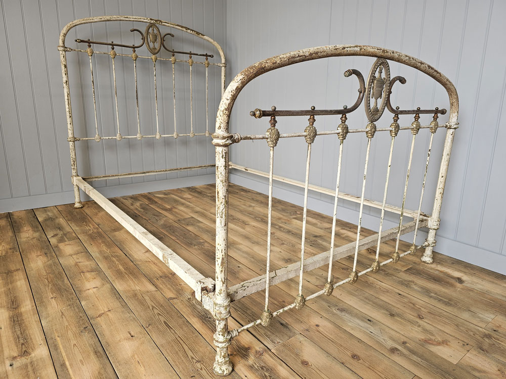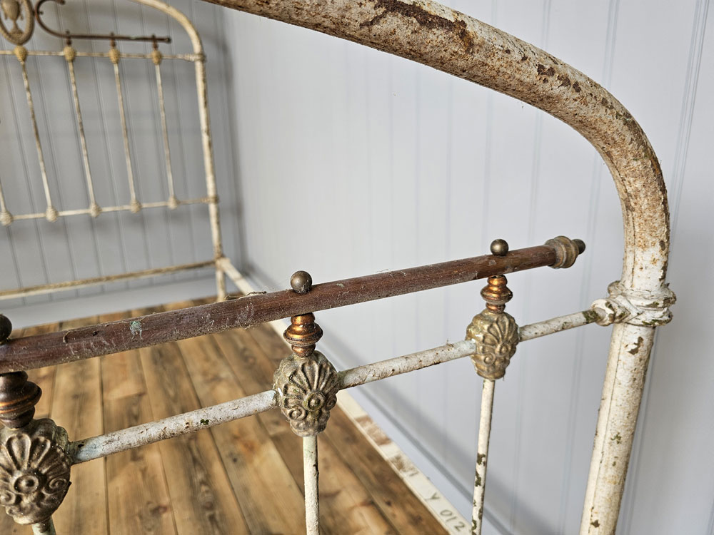 Antique French small double brass and iron bed frame. The bed is awaiting restoration in your choice of colour.