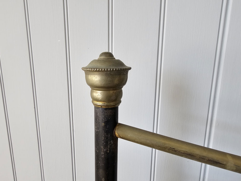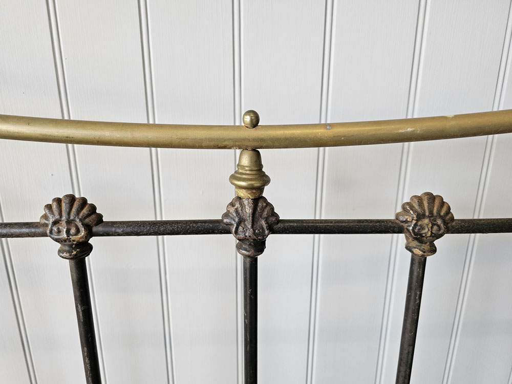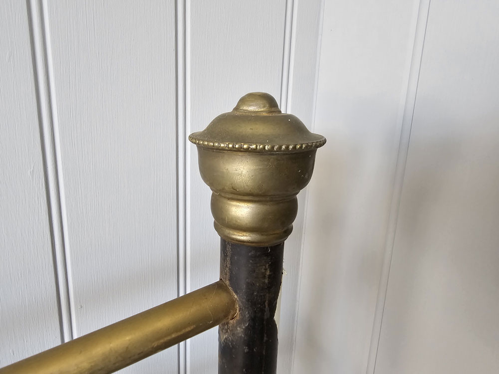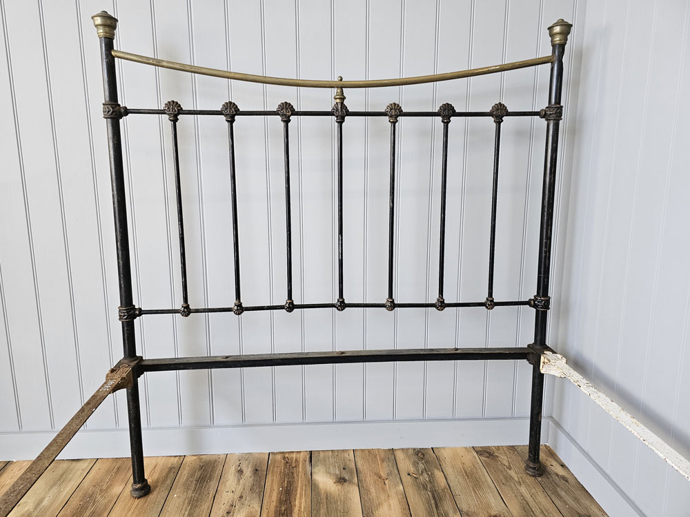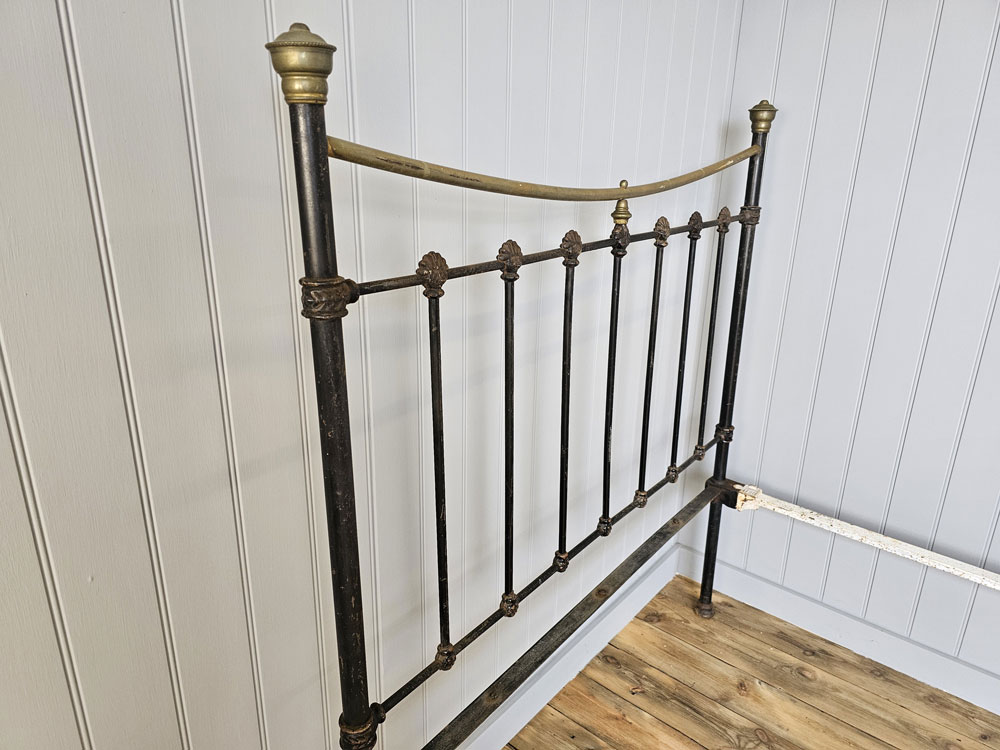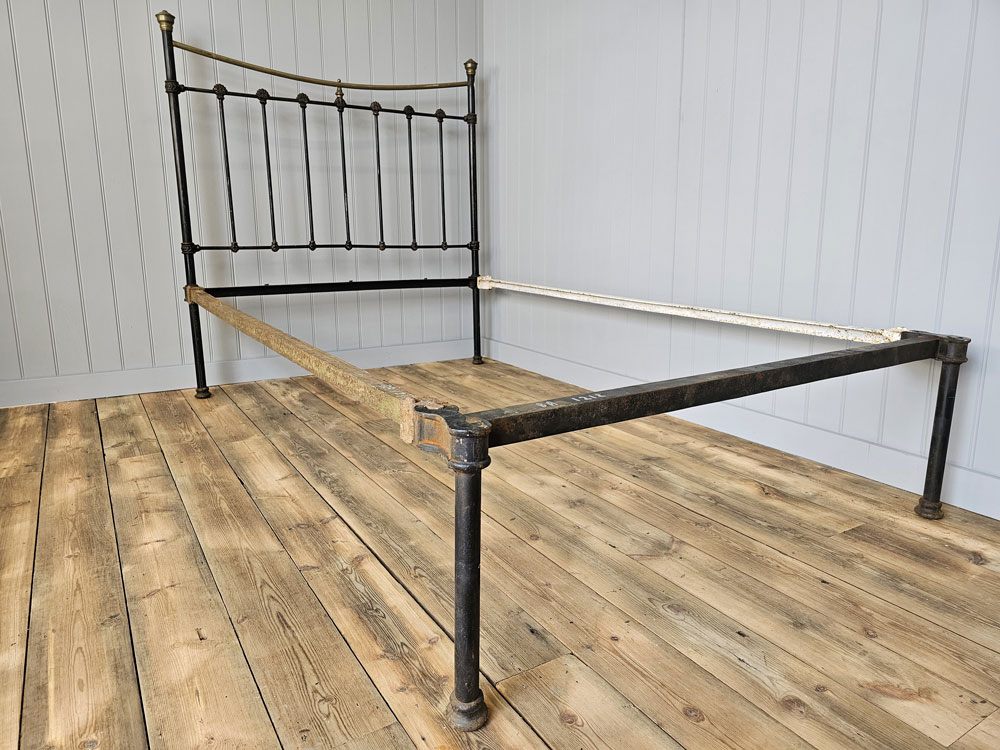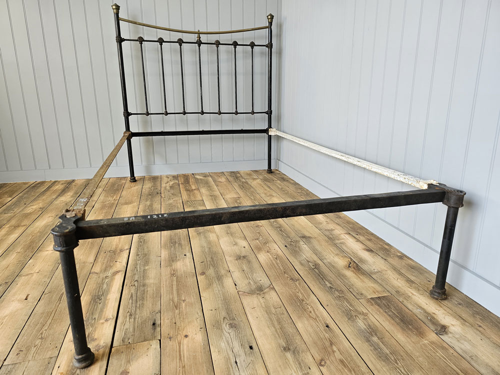 Antique small double brass and iron footless bed frame with with brass caps and dipped rail. Ready for restoration in your choice of colour.