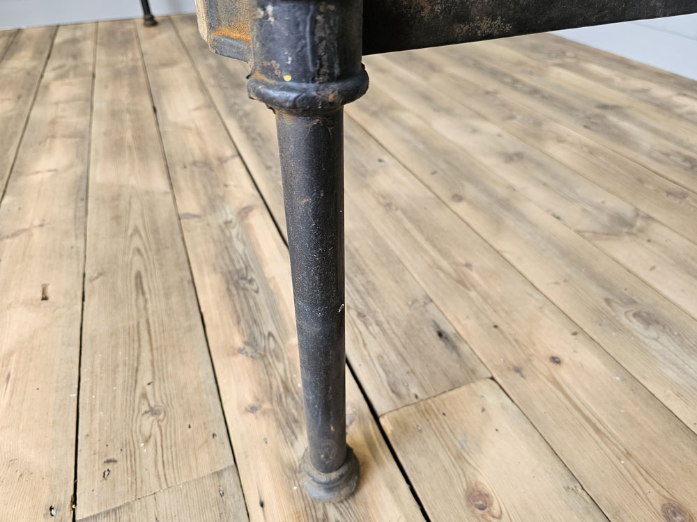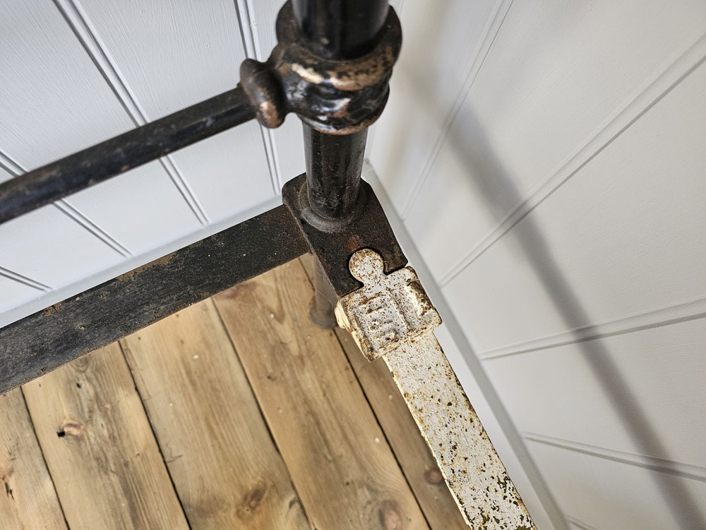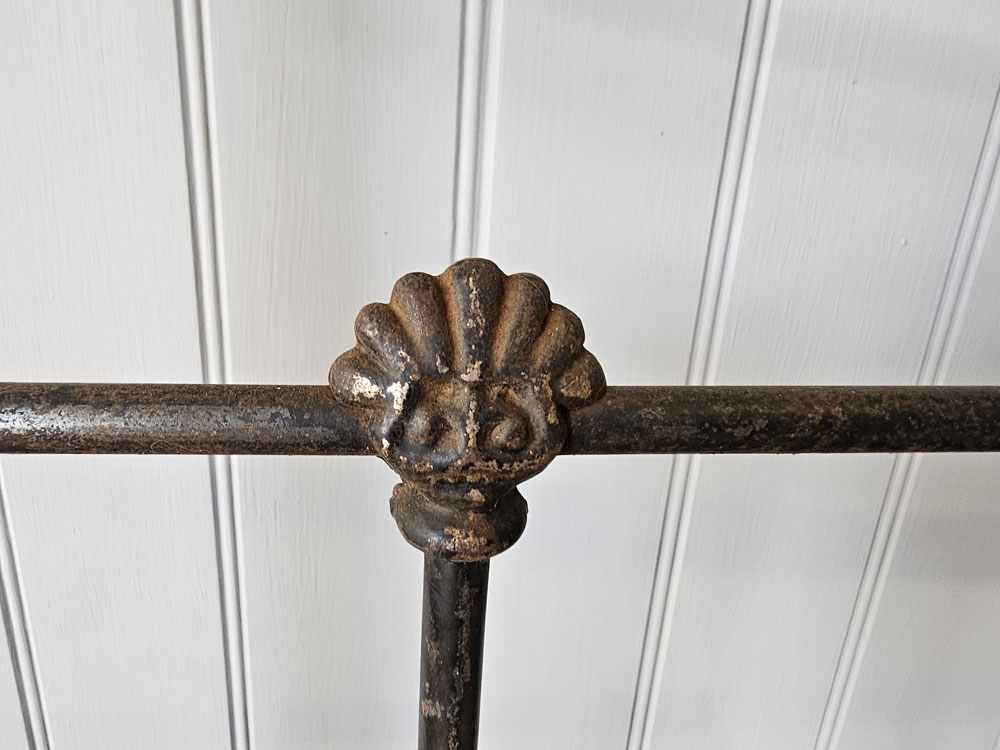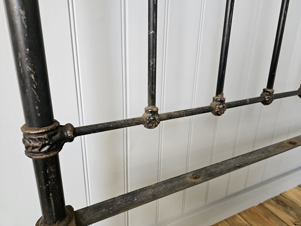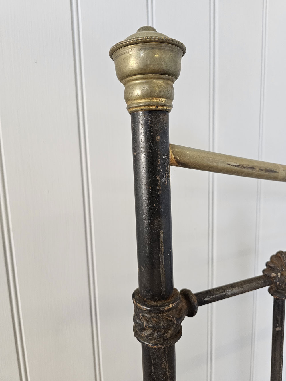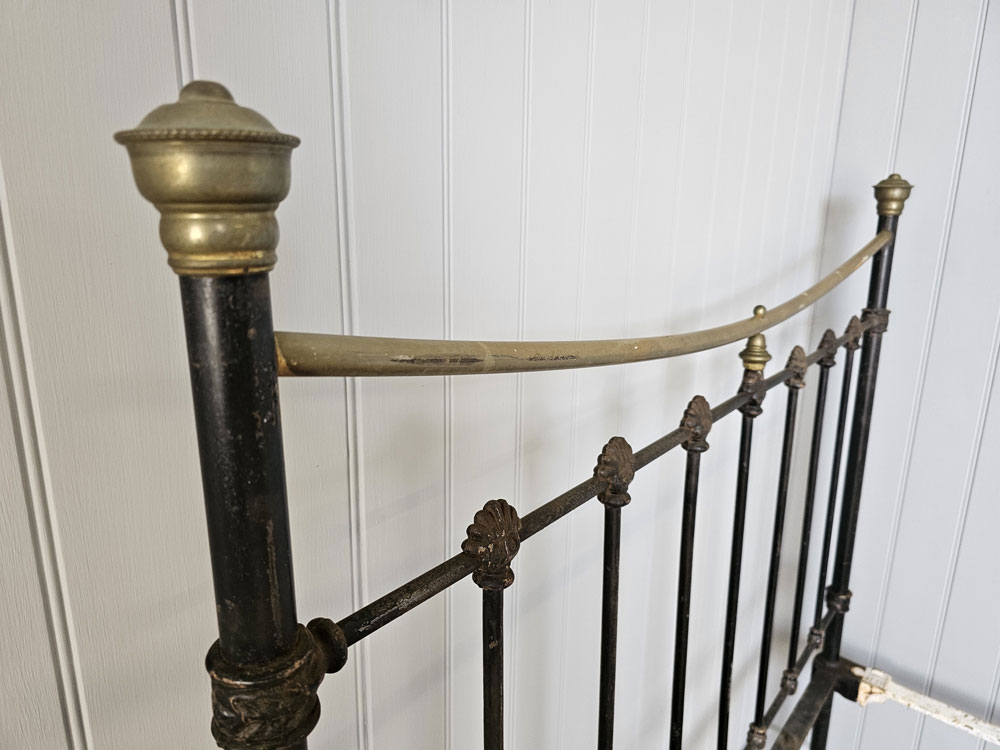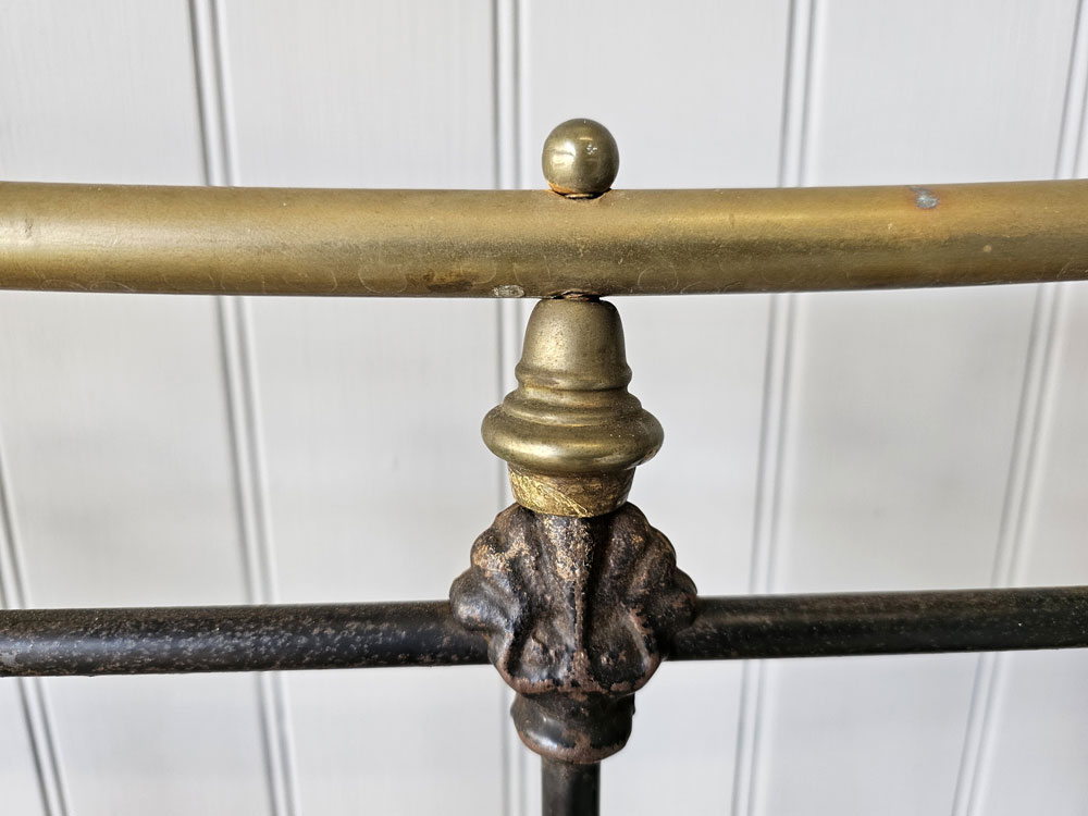 Antique small double brass and iron footless bed frame with with brass caps and dipped rail. Ready for restoration in your choice of colour.