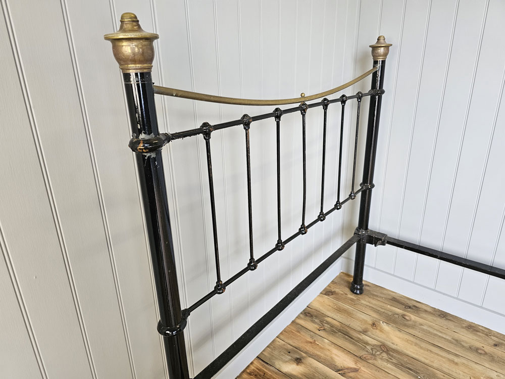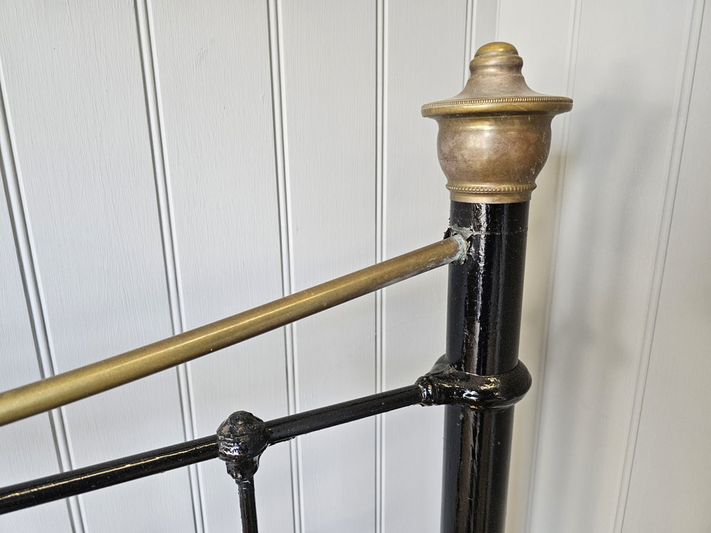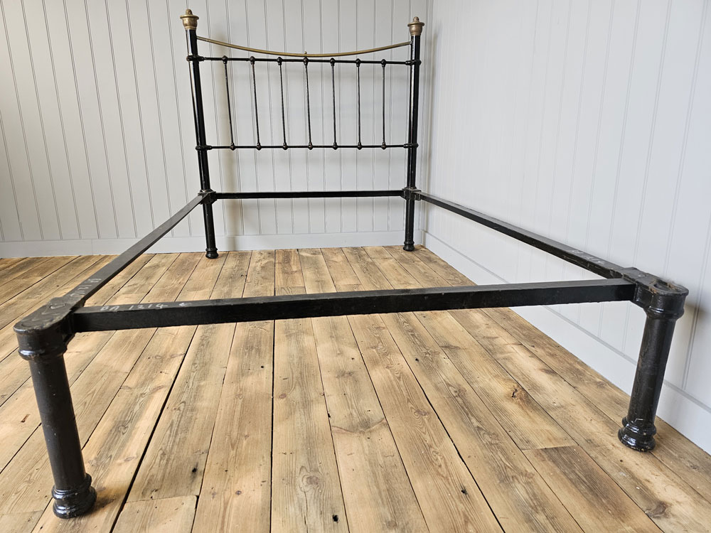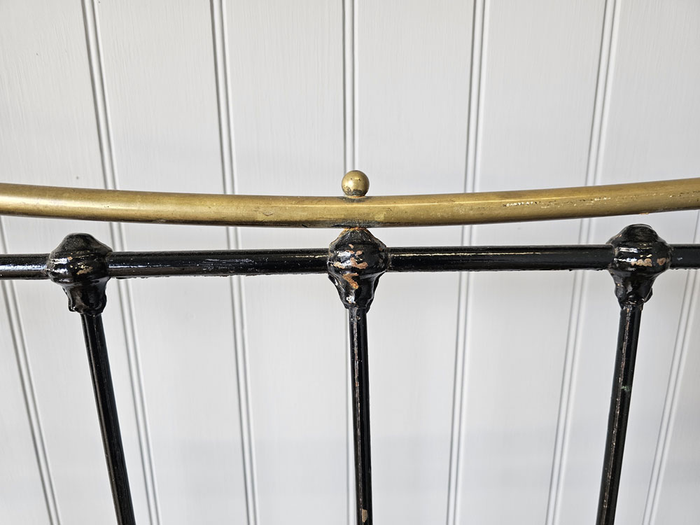 Antique small double brass and iron footless bed frame with larger 2 inch posts, brass caps and dipped rail. Ready for restoration in your choice of colour.