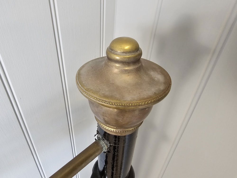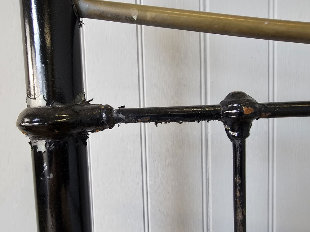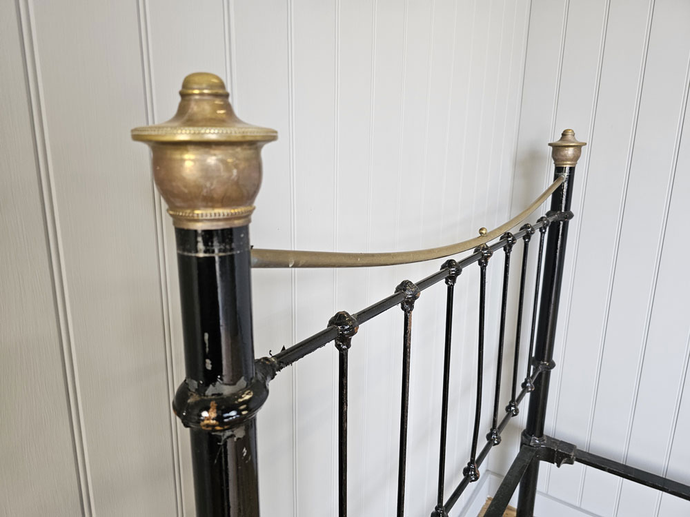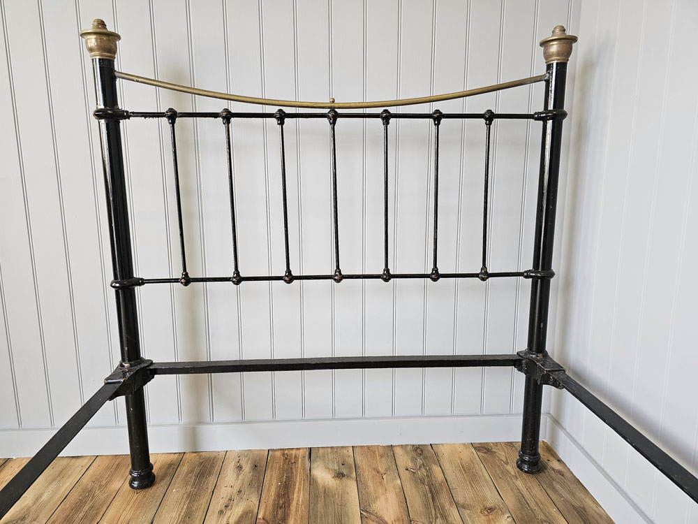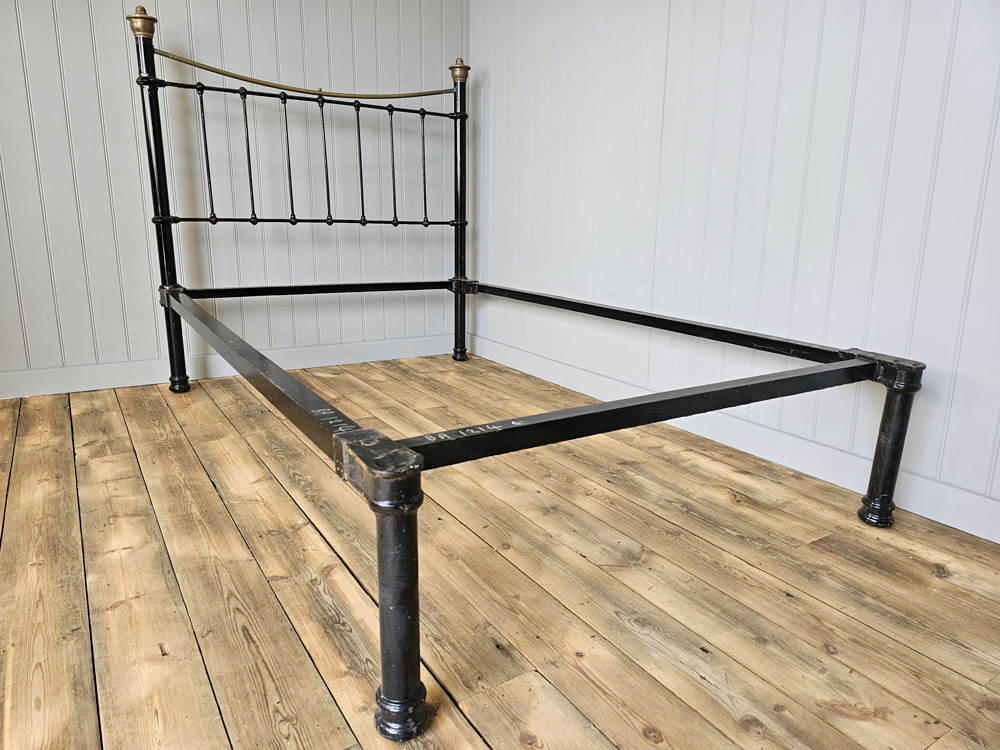 Antique small double brass and iron footless bed frame with larger 2 inch posts, brass caps and dipped rail. Ready for restoration in your choice of colour.